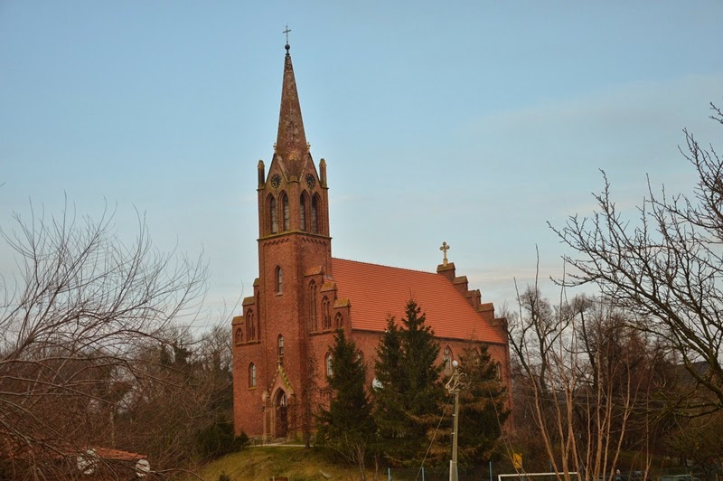 Na wysokości kościoła nad zalewem jest całkiem spory parking – pewnie można by tu zanocować, gdybyśmy byli camperkiem.( 53.974209,14.771412)