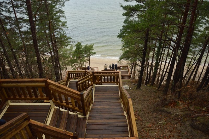 Miedzywodzie oddzielone jest sporym lasek od morza. Przez wydmy poprowadzili schody więc damy radę. Plaże wszędzie fajne, tylko jak dojechać do nich camperkiem…
