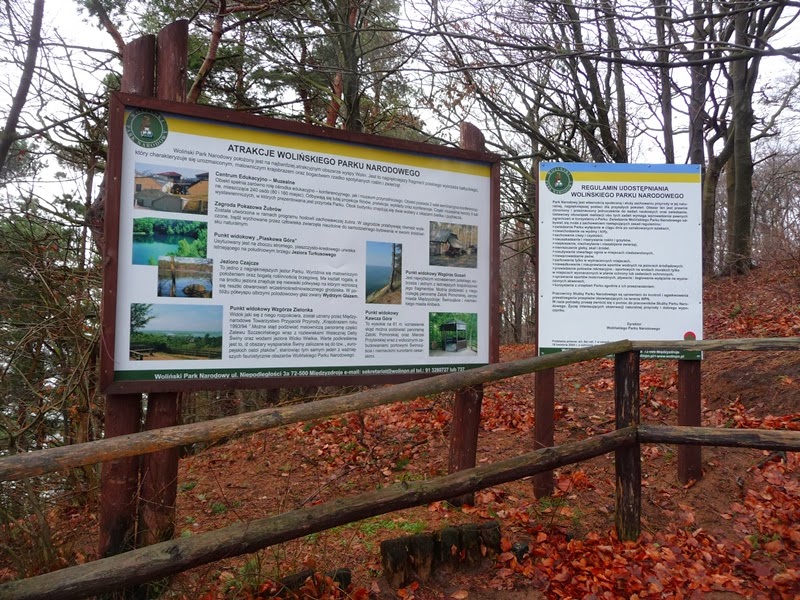 Przed Międzyzdrojami jest zagroda żubrów, Kawcza Góra więc nudzić się nie będziemy. Zagroda dziś niestety zamknięta (w pobliżu jest parking), ale na górę można się wspiąć. Parkujemy zaraz w pierwszej uliczce, gdzieś przy plaży jeszcze przed miastem. Mijamy bramę Wolińskiego Parku Narodowego (od Dziwnowa jesteśmy już na wyspie) i schodami pod górę.