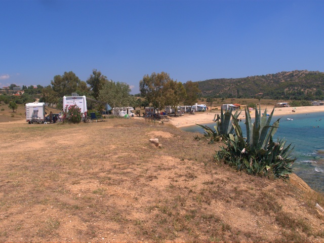Porto Koufo - dojazd dosyć kręty, ale mieści się nawet duży kamper. Jadąc od cypla Sitonii w kier. Toroni, miejsce to widać z drogi. Stoi się na trawiastej łączce pomiędzy jeziorem i plażą. Jest kilka drzew ale nie wysokie. Tutaj nie ma nic więcej (poza pojemnikiem na śmieci). W porcie, ok. 1,5 km są tawerny, sklepy (świetnie zaopatrzona "centrala rybna"), woda nie zdatna do picia. Najbliższa jest w Toroni (ok. 3 km). Woda w morzu zwykle spokojna, bo jest to głęboka zatoka. |