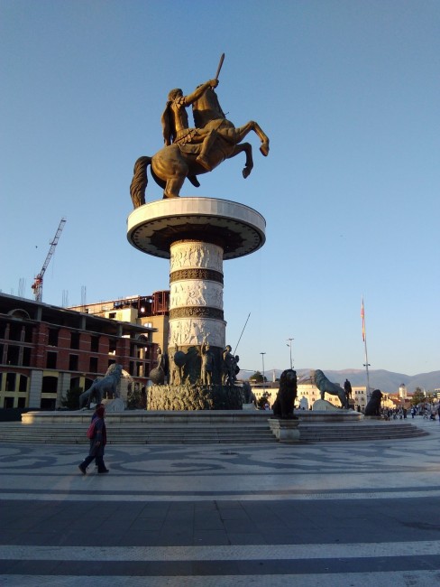 15.09.Przejazd przez Serbie, autostradowo, więc dość monotonnie. Po południu dojeżdżamy do Skopje. Parking z Park 4 night, w centrum, 41.993999 21.4373. Obsluga na wiadomość, że zostajemy na noc, ustawia nas przy budce parkingowych. Idziemy zobaczyc Bucefala. W centrum jest największa ilość pomników na m2. Radosna twórczość upiekszania miasta pomnikami budzi mieszane uczucia. Ale może taki cel chciano osiągnąć. Spacerujemy po Old Bazar i tam bardzo się nam podoba. Duzo sklepików i restauracji. Kolacja z miejscowymi przysmakami kończy miły wieczór.