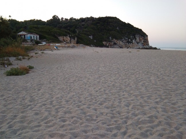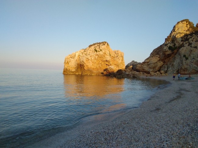 | 18.09. Po dobrych i bezpłatnych greckich drogach, miejscami dwupasmowych, chcemy jak naszybciej dotrzeć nad morze. Na forum było ostatnio wiele relacji o półwyspie Pelion. Obieramy kierunek na plażę Potistika. 39.26537 23.29060. Podzielamy zachwyty jakie o tej plaży czytalismy. Plaża piaszczysto żwirowa, obramowana gorkami i samotnymi skałami przy brzegu. Na skraju plaży znajduje się ruinka domku z besposrednim zejsciem na plażę . Moja żona jest pod urokiem tego miejsca i postanawia się dowiedzieć jaka jest jego cena. Za 7 arów z ruina życzą sobie 200000/dwiescie tys/ euro. Konczymy marzenia o domku na plaży. Stoimy tam dwa dni, a trzeciego po zmianie pogody i burzy, postanawiamy jechać tam gdzie jest słońce. Takie warunki oferuje Evia. |