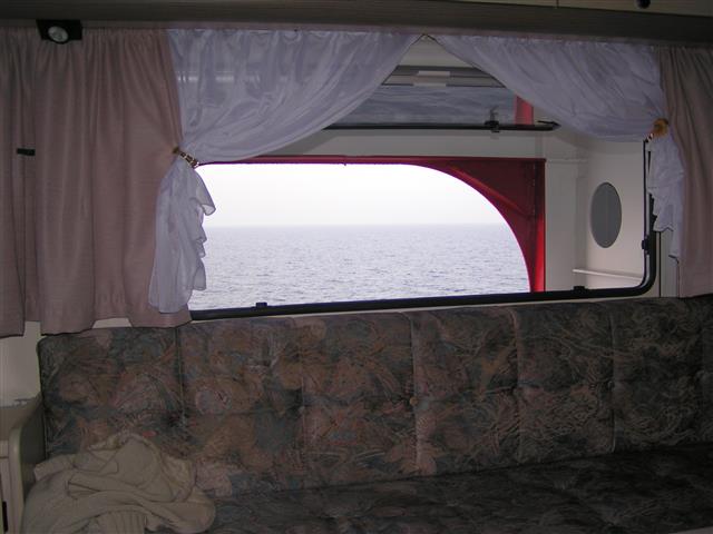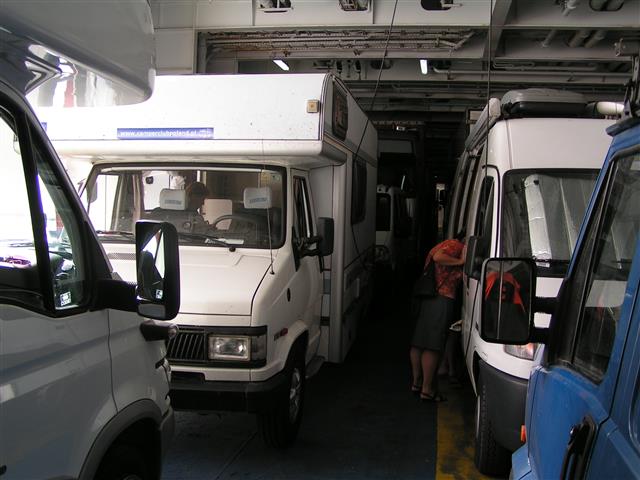 To oznacza, że auto stoi na specjalnym "otwartym", (z oknami) pokładzie z podłączeniem do prądu. Śpi się w kamperze ale korzysta z zasobów całego promu, restauracje, sklepy, baseny itp.