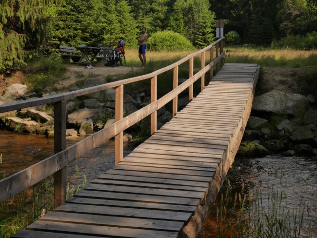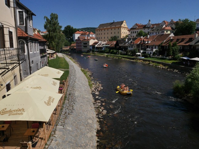 Wracając do Soumarskiego Mostu… to jest właśnie taboriste czyli pole biwakowe. Jest knajpa (nawet dwie), wychodki, woda z ręcznej pompy (pitna) oraz przez środek płynie rzeka Wełtawa –głębokość w porywach 0,5m-1m i jest to główna atrakcja bo odbywają się tym liczne spływy kajakowe oraz te bardziej lokalne czyli materacowe . Jest pięknie, camperka parkujemy nad rzeką (zależnie od upodobań w słońcu lub cieniu po drugiej stronie pola) i odpalamy browarka z lodówki lub idziemy do baru na dobrą 12 pilsnera lub np. smażony ser z frytkami:) W tym czasie dzieciarnia chlapie się w wodzie a my tankujemy campera kanisterkiem 10 litrów z pompy ręcznej pamiętając o chłodzeniu własnego organizmu.