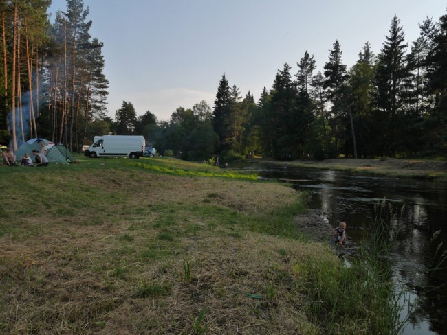 Sympatyczne pole biwakowe z prądem. My mieliśmy tam średnie wrażenia bo najpierw zakopałem się camperem – chciałem w cieniu zaparkować:) a w nocy była burza taka że drzewa łamało na polu. Cena chyba 120koron bez prądu. Na wycieczkę wybraliśmy się tylko tu: https://www.endomondo.com...kouts/556707180 bo następnego dnia lał cały czas deszcz. Wycieczka rowerem fajna i na endomondo widać że w pewnym momencie zrobiliśmy „wycieczkę w głąb okręgu” – taki „kikutek” - to jest ścieżka dydaktyczna na torfowisku – ekstra, na końcu jeziorko. Generalnie okolica bardzo obiecująca ale lał nam deszcz. Przy polu biwakowym płynie rzeka ale dostęp jest ograniczony – kamienie, krzaki itd – dla dorosłego nie ma problemu ale z maluchem problem.
