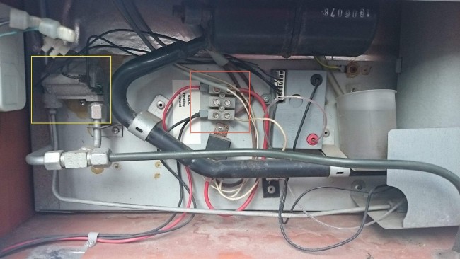 Ale na szybko, to co w czerwonym prostokącie, tam jest +12V gdy silnik odpalony, a to w żółtym to zakładamy, że jest to elektrozawór do gazu i w momencie przełączenia na gaz nie ma tam żadnego napięcia. Dalsze pomysły? Bo gaz gazem, ale piezo słychać działa, a na tym co nazywamy elektrozaworem, jak napięcia nie ma, to zakładam, że gazu do lodówki nie puszcza.