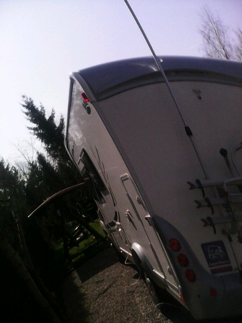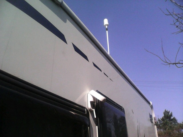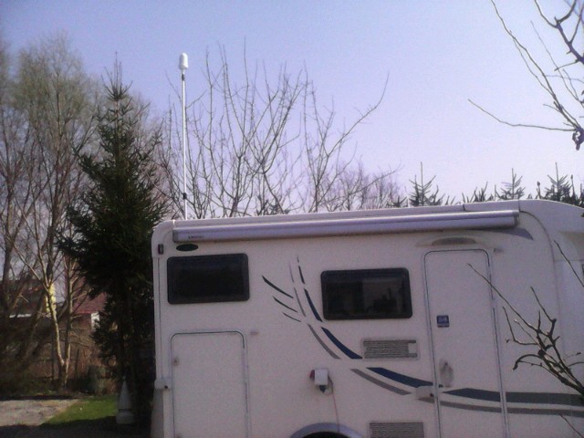 Na teleskopowym maszcie, prawie na 2 / 3metry nad kamperem rozsuwana.. Z kablem w środku masztu.