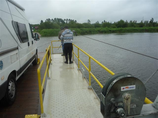P1080298 (Small).JPG Siła napędowa, dwóch przewoźników ciągnących za linę, powoduje, że prom na zasadzie akcji i reakcji odbija od brzegu. Dopiero gdy siła od prądu rzeki wynikająca ze skośnego ustawienia promu do liny przy pomocy widocznego kabestanu jest na tyle duża, że p |