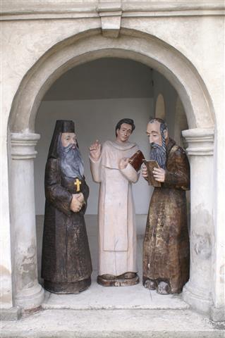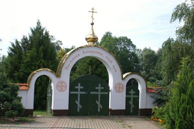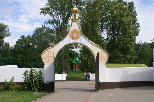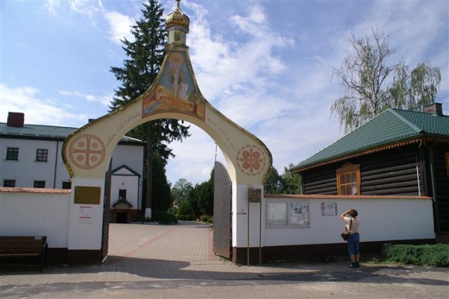 PICT0360 (Small).JPG brama wejściowa na cerkiewny dziedziniec. Widoczny postać św. Onufrego Z DŁUGĄ BRODĄ DO ZIEMI. |