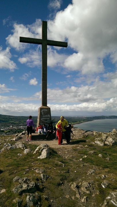 Góra nazywa się Bray Head, a krzyż na górze to po prostu Bray Head Cross. O ile wchodząc na szczyt było cipeło i bezwietrznie, to na szczycie dmuchało tak, że łeb chciało urwać. Trzeba było mocno trzymac dzieci, żeby ich wiatr nie porwał