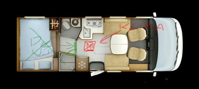 | U mnie klima jest pod łóżkiem z prawej strony auta.Rury idą dołem do lodówki i za obudową lodówki do góry.Jeden wylot z obudowy lodówki w kierunku łóżka(do tyłu),drugi z frontu lodówki do środka auta i trzeci,który jest przeprowadzony górą szafek, w kierunku stolika |