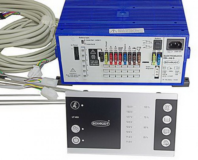 Elektroblok EBL 208-S + panel LT 420 + wskaźnik ilości wody czystej oraz wody brudnej w zbiornikach.Elektroblok jest niezbędnym urządzeniem w każdym kamerze umożliwiającym podłączenie dodatkowego akumulatora (min. 55Ah) do pojazdu. EBL 208 S zawiera moduł baterii (ładowanie 18 A z sieci 230V, charakterystyka ładowania IUoU), zestaw bezpieczników 12V, włączanie pompy wody, przełącznik wyboru dla akumulatorów 6-ogniwowych kwasowo-ołowiowych lub ołowiowo- żelowych , wyłącznik akumulatorów dla wyłączenia w zimie (bez spoczynkowego poboru prądu), monitorowanie akumulatora- odłącza akumulator przy niskim napięciu. Równoległe ładowanie akumulatora części mieszkalnej i akumulatora rozruchowego podczas jazdy. Akumulator rozruchowy jest ładowany po przyłączeniu zasilania 230V prądem ok. 2A. Kompletne zasilanie 12V Z ładowarką 18A. Ochrona akumulatora przed głębokim rozładowaniem. Blok bezpieczników dla zabezpieczenia różnych obwodów 12V. Możliwe podłączenie lodówki AES (z automatycznym wyborem źródła zasilania). Panel LT420 pokazuje stan akumulatorów 1 i 2, poziom w zbiornikach wodny czystej i brudnej. Ma wyłącznik OFF dla całego systemu ze wskaźnikiem LED. Wyłącznik pompy. Diody LED wskazują: napięcia akumulatorów, poziom wody czystej lub brudnej, pompa ON / OFF, 12V ON / OFF, 230V dostępny. W zestawie: Elektroblok EBL 208-S.Panel LT 453.Sonda do pomiaru zbiornika wody czystej. Czujniki poziomu za zbiornika ścieków. Kable i materiały połączeniowe.Waga 3,9 kg. Wymiary: Elektroblok EBL 208 S: wys.130 x szer. 275 x 170 mm, Panel LT 453: szer176 x wys106 mm x 35mm. Producent: firma Schaudt. Electrobloc EBL 208 S.Zawiera moduł ładowania akumulatora (18 A, charakterystyka ładowania IUoU), kompletny rozdział 12 V, zabezpieczenie obwodów 12 V oraz dalsze funkcje kontrolne i monitorujące: Bistable 12V główny przekaźnik przełącznika. Energooszczędny stopień przełączania dla pompy wodnej odpowiedni dla 6-ogniwowych akumulatorów kwasowo-ołowiowych i ołowiowych (wybór za pomocą przełącznika). Odłącznik akumulatora do wyłączania zimowego (brak zużycia prądu spoczynkowego).Monitor baterii do wyłączania odbiorników 12 V w przypadku zbyt niskiego poziomu baterii w salonie. Podłączenie do kontrolera ładowania słonecznego LR 1218. Wyjścia rozdzielacza 12 V zabezpieczane indywidualnie, częściowo przełączane za pomocą przekaźników. Równoległy ładunek obudowy i akumulatora rozruchowego. Dostawa wraz z kablem zasilającym. Do pracy wymagany jest panel sterowania z akcesoriami (na przykład nr art. 051635). Łączna waga wszystkich komponentów: 1,9 kg. Wymiary (szer. X szer. X gł.) W mm: 130 x 275 x 170. Shudders Panel LT 453 pokazuje stan baterii w woltach i poziom 2 zbiorników na wodę. Przełącznik roboczy pompy, 12 V on / off na panelu. Kontrolka LED podnapięcia akumulatora, pompa, 12 V zał. / Wył. 230 V. W komplecie z akcesoriami przyłączeniowymi i kable połączeniowym 5 m.