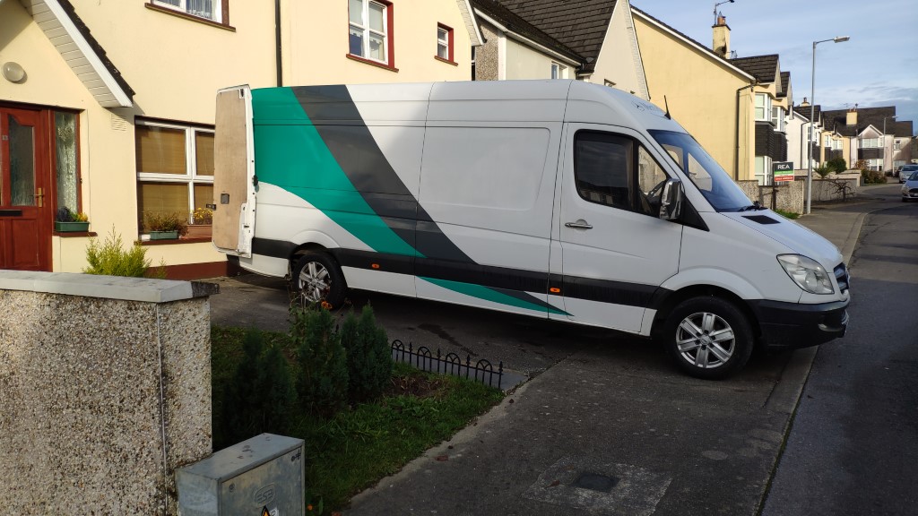Mercedes Sprinter, L4H2 (czyli van o wymiarach 6,94m długości, 2,72m wysokości i 1,99m szerokości. Wymiary paki to 4,3m długa, 1,94m wysoka i 1,78m szeroka). Waga przed zabudową nieznana (ponad 2 tony na pewno). Będziemy się ważyć po zdemontowaniu sklejki i grodzi. Silnik 2,1 o mocy 150 koni, skrzynia 6. Nawet się tym fajnie jeździ. Auto z 2009 roku.