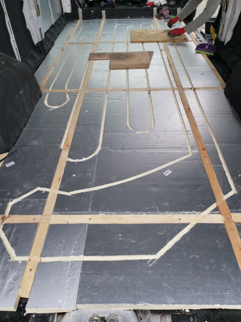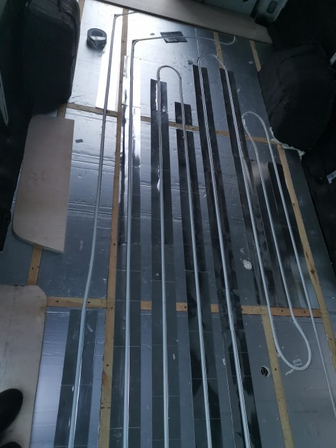 Rury pex 16 mm, rozstaw dość gęsty, gęściej byłoby ciężko. Dodatkowo są blachy transmisyjne. Prócz tego nagrzewnica taka: https://allegro.pl/oferta/nowa-dodatkowa-nagrzewnica-webasto-12v-9kw-d-8055946974 z regulatorem obrotów takim: https://allegro.pl/oferta/przelacznik-4-stopniowy-nagrzewnica-uniwersalna-6668512036