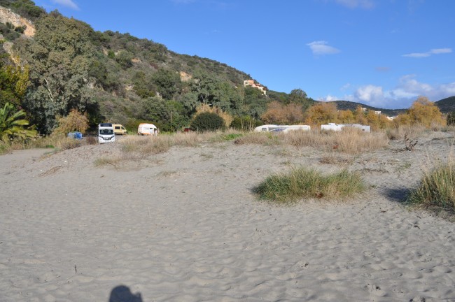 Jedziemy dalej , tym razem posiedziec z dwa dni znów na tyłku w jednym miejscu , jeszcze woda po drodze. Wodę nabieramy na słynnej plaży z murkiem , z prysznica plażowego. Pogoda od rana wreszcie inna , słońce cały czas , ciepło 16 stopni pokazuje termometr w aucie. Na Kokkinias plaża zawalona roślinnością wyschniętą wyrzuconą z morza , więc to nie miejscowka dla nas... zwłaszcza ze kolega mors ,to do wody planuje wkońcu wejsc , a tu nie ma nawet jak. Jedziemy na jedną z naszych ulubionych miejscówek , czyli na Bozas . Bozas ze zrzutem kota , wodą , można stać i stać tam, ale my mamy tylko 2 tygodniowy wyjaz, juz tydzien pierwszy prawie minął. A chcemy naszym współtowarzyszom podrozy jak najwiecej pokazać tej Grecji.... no ok , nie do końca całej Grecji a Peloponezu. Pomysłów wiele ,miejsc wiele ale wszystkiego nie da się odchaczyć , przecież my to odkrywaliśmy przez kilka lat , za każdym razem coś nowego. Docieramy na plażę... sorki nie na plażę , a na parking , ale tu zielono , trawa nawet jest... coś co widzimy tutaj pierwszy raz , zawsze to suche ściernisko . Można zaparkować gdziekolwiek , Grecy tak tłumnie raczej zimą nie przyjezdzają tutaj więc im miejsca nie zajmiemy. Tutaj początkowo myślałem , że spędzimy Wigilię , ale nie udało się. Okazuje się , że padła nam lodowka , pół lodowki zarcia do wywalenia , smród niemiłosierny. Przed wyjazdem do Grecji , czyściłem palnik bo przytkany był , po tym zabiegu zaczęła na gazie chodzić normalnie, niestety podczas wyjazdu znów problem powrócił. Rano na drugi dzień wymontowalem palnik , posprawdzaliśmy , no wszystko ok , złożyłem , lodowka chłodzi... ale tylko przez niedługi czas , pózniej problem znów wraca, stukanie w palnik na chwilę pomagało , ale tylko na chwilę, potrafiła przez kilka godzin zamrozić w zamrażalniku wszystko po czym znów wszystko się rozpuszczało. Winna dysza pewnie , trzeba nową, ale to dopiero w domu, trzeba jakoś żyć bez lodowki. Pogoda wreszcie taka , ze można cały dzień siedzieć na plaży, promienie słońca , brak chmur , ciepło , w słońcu termometr pokazuje ponad 20 stopni , jest Super, wreszcie to na co czekaliśmy podczas tego wyjazdu. Prawie cały dzień z krótkimi wyjatkami na połażenie po okolicy spędziliśmy na plaży. Miło było spędzić w takim klimacie sobotę, zwłaszcza , że mieliśmy info iż u nas we Wrocławiu sypie śnieg i zimnica panuje wszechobecna. Jeden z kamperowcow z niemiec chciał mi pokazać gdzie jest zrzut kota i wody , zrobiłem nawet mu tą przyjemnośc i poszedłem z nim , żeby mi pokazał choć dobrze znałem gdzie co i jak . Spotkaliśmy też hiszpana sprzedającego soki z citroena jumpera widocznego na jednej z fotek , spotkaliśmy go pół roku wcześniej na Salanti również. Na Bozas było wiecej ekip z Polski , międy innymi kolega z Camperteam . yamah bo o nim mowa , milo było poznać , chwile pogadaliśmy , kolejnego dnia po spędzeniu znów dniówki w ciepełku, wieczorem ruszyliśmy dalej. Plan to Elafonisos, znając realia wysp , wcześniej tankująć gdzieś gas po drodze i paliwo. Z racji , że my lubimy klimaty starych aut produkcji polskiej , ale tylko za granicą jak jakies trafimy , w miejscowości Papadianika nieopodal Bozas już drugi raz natkneliśmy się na FSO 125p Pickup w kolorze granatowym , nie zdążyłem mu fotki strzelić, stał i w lecie i teraz w samym rynku, w roznych miejscach więc widać jest na chodzie. Może ktoś kiedys utrafi go na fotce . Na prom na Elafonisos dotarliśmy w niedzielny wieczór , okazało się , że ostatni prom odpłynął godzinę wcześniej. Na przystani wiało dość mocno. Zadecydowaliśmy , że jedziemy na pobliską Naritziona Beach na nocleg , to tylko 5 km.... przez gaje oliwne... i znów kamper wróci z Grecji porysowany od drzew .