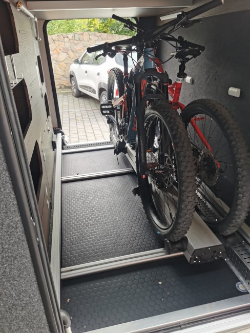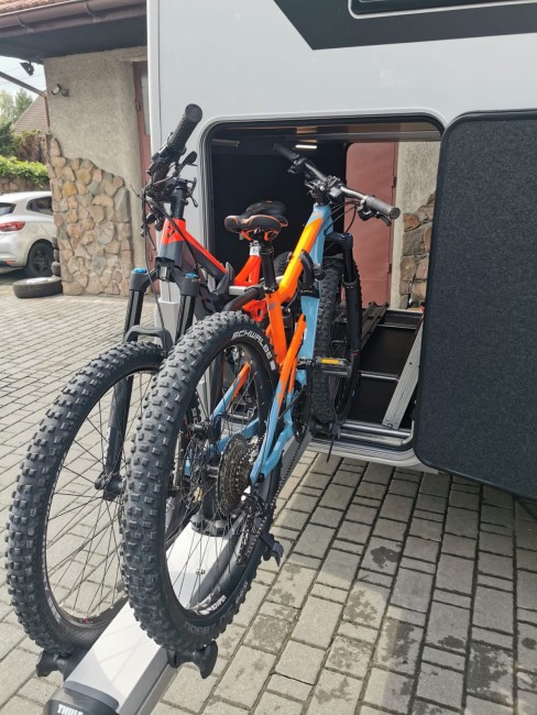 Wcześniej ładowałem rowery ręcznie wnoszą je do bagażnika jest to spora gimnastyka, obecnie wyjeżdżam bagażnikiem poza garaż tam zapinam i wsuwam podobnie jak na tylnej ścianie zewnętrznej ciuchy lepiej bo nie tak wysoko
