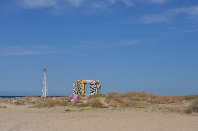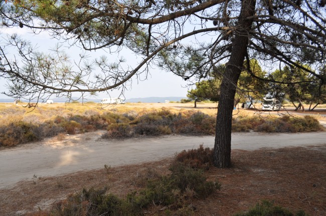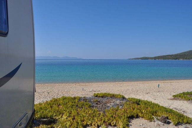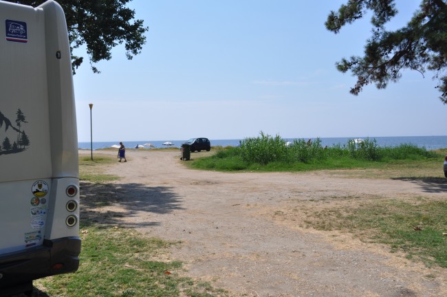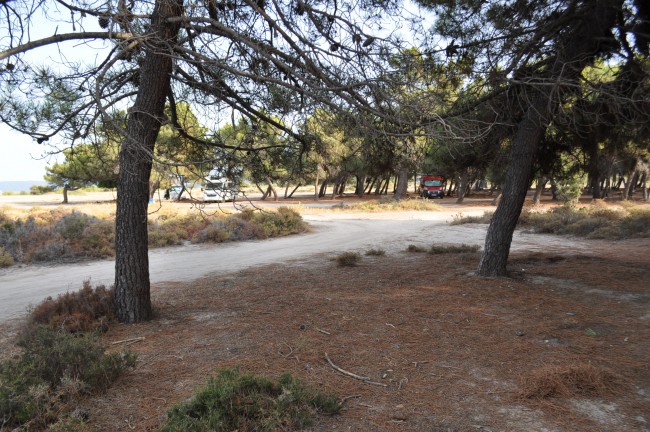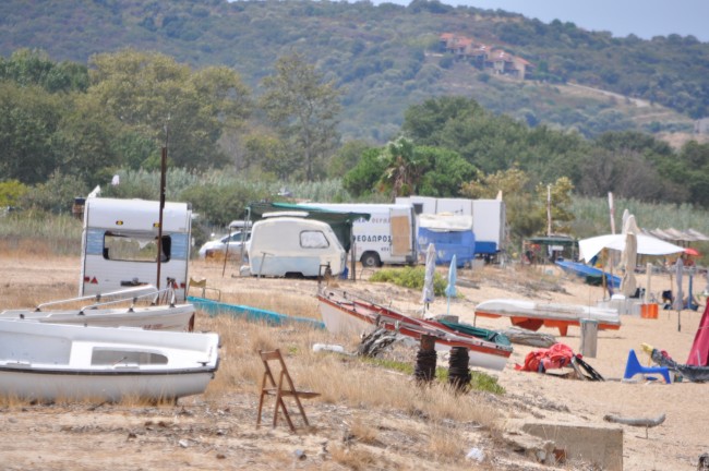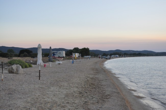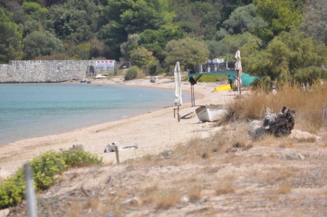 W nocy dotarliśmy na plażę Komitsa, okolica wyglądała wtedy niezbyt zachęcająco , co kawałek porzucone przyczepy kempingowe bez szyb itp. Niedaleko od brzegu świeciły się równomiernie rozstawione światła , myślałem , że to drugi brzeg i dotarliśmy nad jakąs zatokę. Z rana okazało się , że to były rozstawione punkty gdzie sieci rybackie były na noc zarzucone.... zatoka o jakiej myślałem to , to nie była. Za dnia miejsce okazało się nawet całkiem fajne , cisza spokój , zero ludzi , zero kamperów. W okolicy było cale osiedle domków rekreacyjnych , i stamtąd jedynie przyjeżdzało starsze małżeństwo Grekow , jak w zegarku , codziennie o tej samej godzinie i o tej samej wyjezdzali. Na plaży jedyne co było takie psujące widok , to wbite rury do montowania parasoli , niektóre nawet stały ze złożonymi parasolami już tak zniszczonymi od słońca , ze dotknięcie ich spowodowałoby pewnie ich rozpad. Kupe łódek , gdzieś w oddali dodatkowych kilka osób na plaży. Miejscówka nam się spodobała tak , ze staliśmy tam z dobre trzy dni, aż nie skończyła się woda i zaszła potrzeba gdzieś skorzystania ze sklepu. W nocy wyjące kojoty , jedyne co to dokuczliwe były biegające bezpańskie psy, zwłaszcza wieczorami. Jakieś 300 metrów dalej był mur i płot oddzielający zamknietą część półwyspu z tą ogólnodostępną. Jednej nocy po północy słyszymy jeżdzą auta co chwile jak nie do płotu , to wraca , i tak kilka razy. Aż w końcu patrze , a widać światła wjezdzające juz wysoko na wzgórze daleko za płotem , na zamknietej części półwyspu. Godzinę pózniej na sygnałach świetlnych policja koło nas przejechała w tamtym kierunku , ale po chwili wracali. Coś się działo tam. Z rana radiowóz wrócił i zatrzymał się koło nas , myślałem , że się przyczepią do nas o miejsce postoju , ale nie , ich interesowało tylko czy coś w nocy widzieliśmy, jakieś samochody jeżdzące tutaj bo ktos nielegalnie wdarł się na teren "mnichów" , póżniej sobie pojechali. Co tam się działo do dziś nie wiemy , ale to nas nie zraziło od pozostania tam na klika nocy. Któregoś dnia dojechał inny kamper z niemiec , starsze małżeństwo które przyjechało na dwa auta , kamperem i za kamperem Ford Fousion taki dośc leciwy. Niemcy przyjechali z niemiec na dwa auta , drugie mieli na okoliczne zwiedzanie.... no można i tak widać... Gdy już zaszła potrzeba wyjazdu stamtąd , wyjechaliśmy inną drogą niż przyjechaliśmy , dużo lepszą , aczkolwiek szalu nie było jakiegoś , dziurawa szutrowa droga gdzie do główej trasy było jakieś 7km więc nie mało. Zauważyliśmy też , ze pobliską tawernę na plaży na której byliśmy wskazują duże pomalowane na zielono głazy , więc wystarczyło kierować się w nocy po nich, a dojechalibyśmy ciut lepszą trasą. Po drodze znak rozpoznawczy , porzucona Lada Niva , to był taki swego rodzaju punkt orientacyjny jak pózniej tłumaczyłem znajomym jak tam dojechać , którzy wybrali się kilka tygodni pózniej tam. Jeszcze raz pojechaliśmy do Uranupoli na jakieś pamiątkowe zakupy. W miejscowości Lerissos są markety , Lidl , My Market więc jest gdzie zakupy zrobić , niestety wszystkie kapliczki w okolicy były pozbawione wody , prócz jednej koło praktycznie samego Lidla. Woda nabrana tam i ruszyliśmy na nową miejscówkę , tym razem obraliśmy za cel tą plażę koło Stratoni którą widzieliśmy, ale tam nie wjechaliśmy , stwierdziliśmy , ze tam wjedziemy a co... Niestety po dotarciu , przeczołganiu się po dziurawej drodze dotarliśmy na taki pseudo parking w lesie , śmieci, śmieci i jeszcze raz śmieci , do tego pełno opakowań po olejach silnikowych , niektóre opakowania ze zużytym w środku olejem... nic przyjemnego , plaża okazała się , że lepiej wyglądała z drogi jak się ją widziało niż jak się na niej było. Opuszczona wręcz rezydencja , z powybijanymi oknami , dochodzącymi z tamtąd róznymi glosami ludzi odstraszyła nas , miejsce według google nazwane "Αμμόλοφοι Στάγειρα Άκανθος" i określone jako trasa turystyczna . Wrócilismy do Lerissos, a dokładniej na lerissos beach , w okolicy ładny lasek piniowy i cale obozowisko , kampery , namioty , przyczepy , co kto chciał , więc miejsce sobie w cieniu znależliśmy i zostajemy... Udaliśmy się na plażę która jak się okazalo blisko nie była , wlezliśmy do wody, a tam okazało się , że metr od brzegu juz nie czuć dna , plaża nie była zła , ale wejście do wody , to nie dla dziecka... Ale nic , zostajemy , robimy obiad i już. Po powrocie do auta nie cieszyliśmy się długo spokojem , przyszedł do nas inny kamperowicz z pl i poinformowal nas , ze była policja i postraszyli go , ze jak będzie wieczoram dalej tu stał to mandat , podobno objechali wszystkich ktorzy tam stali. No , sytuacja taka niezbyt przyjemna , w sumie do nas nie dotarli , ale stac tam i czuć "oddech policji" na sobie która juz z bloczkiem mandatowym będzie stała nie był komfortowy. Spotkaliśmy tam jeszcze starsze małżenstwo z pl kamperem , których spotkaliśmy 3 tygodnie wczesniej jak wracaliśmy z Grecji do domu , a spotkaliśmy ich na plaży Dalan w Albanii. Chwile pogadaliśmy i po konsultacjach miedzy sobą doszliśmy do wniosku, że wracamy na plażę Komitsa. Wada jej była tylko taka, że grama cienia nie było , bo nie bylo drzew...