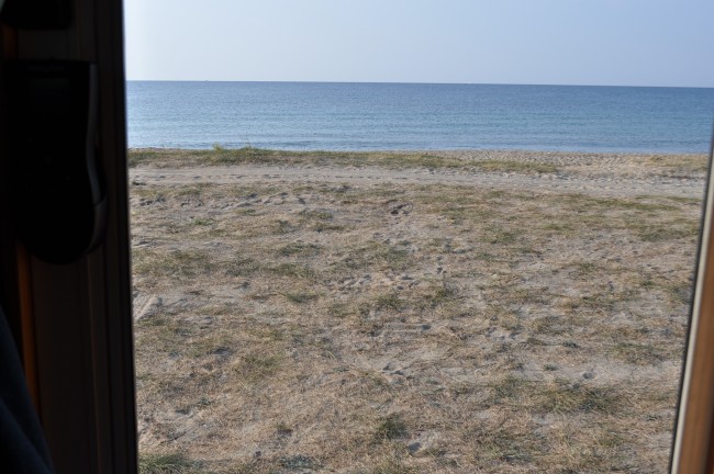 Stratoni , to taka miejscowości juz przy morzu , tam mieliśmy cos znaleśc. Po dotarciu do miejscowości wiedzieliśmy stojące kampery przy plaży , ale kierując się zasadą , z dala od miejscowości to nikt sie nie będzie nas czepiał, ruszyliśmy w kierunku "palucha" Atos. Dosłownie kilka kilometrów za Stratoni , wyłoniła się piękna , szeroka długa pusta plaża, robiło się już ciemnawo , na P4N widniała jako punkt gdzie mozna się zatrzymac , jednak po dotarciu do zjazdu do niej , odpuściłem sobie wjazd tam droga niezbyt fajna była. Obok była jakas opuszczona posiadłość pod której płotem trzeba było po dziurach się przedostać do plaży. Ruszyliśmy dalej docierając do ostatniej miejscowości do jakiej mozna dojechac , czyli Uranupoli. W Uranupoli zaparkować... można zapomnąc , w miejscowości gdzie tylko była możliwośc to poupychane kampery , zaparkowaliśmy gdzieś dosyć daleko od tej takiej chyba najbardziej turystycznej częsci miasteczka i tam udaliśmy się z buta , oczywiście wczesniej przejeżdzając je całe aż do końcowego parkingu, gdzie miejsca do zaparkowania też nie znależliśmy. Oczywiście zapanowała ciemnośc , a my nadal bez miejsca do noclegu , oczywiście znów nam pomogła znana strona , więc ruszyliśmy tam gdzie nam pokazywała nawigacja. Plaża Komitsa... drugi brzeg "palucha" od Uranupoli, nawigacja tak nas przeczołgała po takich drogach, że juz zwątpiłem w pewnym momencie czy gdzieś dojedziemy... Na tą plażę nawigacja nie doprowadzi... ona się po prostu gubi w tamtych rejonach, o cym zresztą przeczytaliśmy. Nam jakoś się udało , po ciemku , w środku nocy prawie jak to u nas zwykle ma miejsce , po drogach tak wąskich , dziurawych , że w pewnym momencie myślałem , ze buda kołysząc mi się na koleinach będzie odbijać się od płotu z jednej i z drugiej strony jakiś Greckich daci... Jednak dotarliśmy do czegoś lepszego wysypanego kamieniem i w niepewności pojechaliśmy dalej przed siebie... docierając do.... jakiejs plaży...