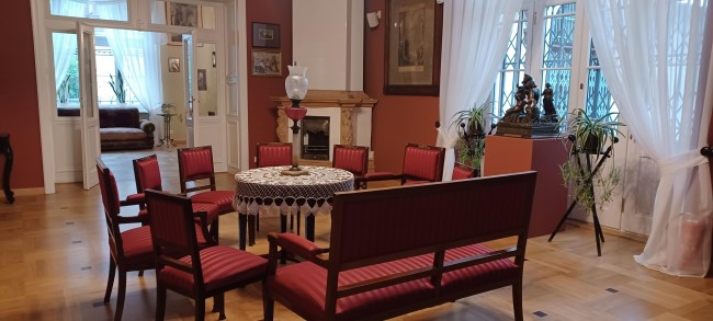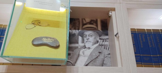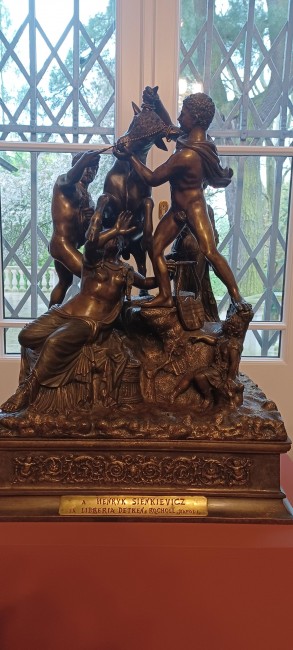 Wreszcie stanęliśmy przed pałacykiem o jasnej elewacji, wyposażonym w wieżyczkę oraz figurę, no jakżeby inaczej, husarza. Po wejściu do środka wraz z biletami otrzymaliśmy audio przewodniki, które poprowadziły nas po sienkiewiczowskim domostwie. Najpierw gabinet z oryginalnymi meblami należącymi do pisarza, w tym stylowe biurko z nie mniej stylowym kałamarzem. Następnie salon z kompletem mebli, zbiorem obrazów, pamiątek oraz darów. Potem jadalnia, a w niej oprócz oczywistego stołu, kredensu i naczyń, jeszcze trochę fotografii oraz wyjątkowy zegar, który zamiast cyfrowych godzin ma litery układające się w nazwisko Noblisty. I ostatnie na parterze osobiste pomieszczenie czyli sypialnia pisarza.