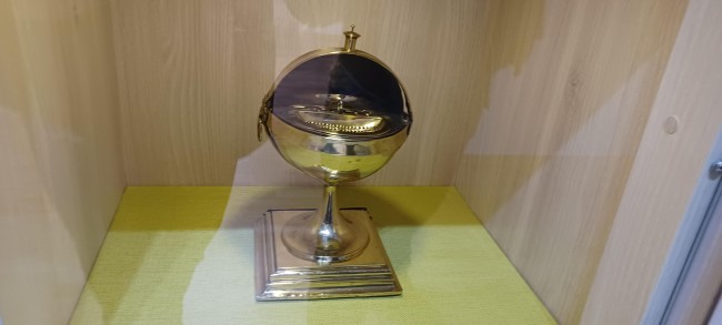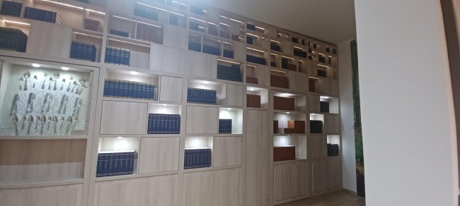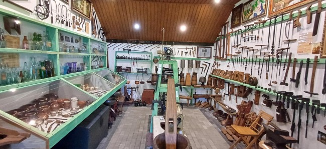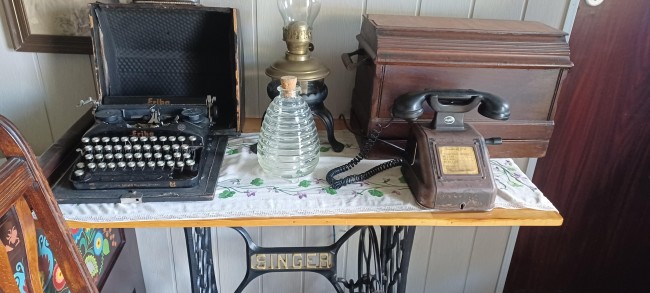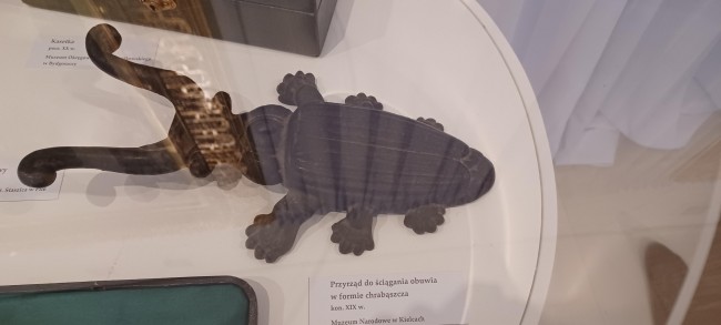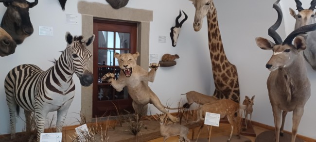 Udaliśmy się na piętro, gdzie zaskoczyła nas taka jakby meblościanka, częściowo zabudowana jasnymi płytami, częściowo przeszklonymi wnękami. Kryje ona w sobie zbiór pamiątek po pisarzu nie tylko widocznych przez szyby, ale ujawniających się po naciśnięciu niektórych drewnianych płyt. Na jednej z półek, zgodnie z sugestią pani pilnującej muzeum, przekręciliśmy książkę i otworzyły się drzwi do ukrytego pokoju z kolekcją pamiątek przywiezionych przez pisarza z Afryki. Ciekawa to forma ekspozycji muzealnej!