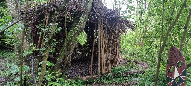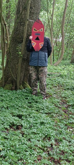 Do Oblęgorka przyjechaliśmy w późny piątkowy wieczór i stanęliśmy na nocleg na bezpłatnym cichym parkingu pomiędzy aleją lipową a zespołem placówek oświatowych. Nazajutrz rano udaliśmy się w kierunku pałacyku mijając po drodze bardzo fajną ścieżkę dydaktyczną. Zanim słynna 4-rzędowa aleja lipowa doprowadziła nas do pałacyku skręciliśmy w leśne chaszcze skuszeni maską-drogowskazem, a tam odkryliśmy szałasy, afrykańskie maski i inne takie gadżety nawiązujące do afrykańskich podróży Sienkiewicza.