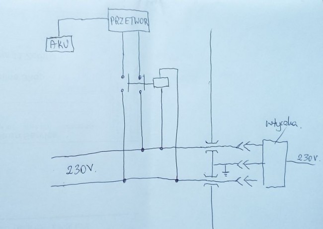 Gdy wykryje prąd z zewnątrz rozłącza 230v z przetwornicy i odwrotnie