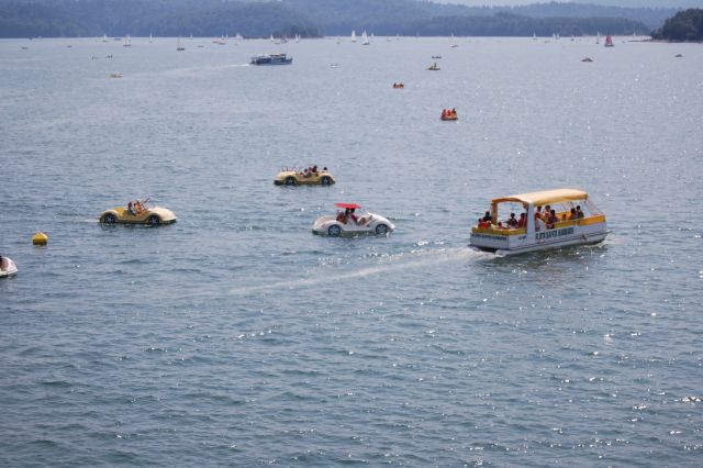 Po śniadaniu, z krótkim postojem w Lesku (interesujący cmentarz wojenny z czasów I w.ś. oraz synagoga, sympatyczny ryneczek), udaliśmy się na zaporę solińską. Postanowiliśmy wjechać od strony Bóbrki przez Jawor. Niestety, nie wzięliśmy pod uwagę, że była to upalna niedziela i tuż za Jaworem trafiliśmy na gigantyczny korek, który można było zawdzięczać w dużej mierze miejscowej policji. Generalnie małe rozczarowanie. Ludu więcej niż w Międzyzdrojach. Dla ochłody postanowilismy skorzystać z rejsu stateczkiem. To była nasza kolejna porażka. Sceny wejścia na pokład żywcem przypominały te z obrazu Matejki "Bitwa pod Grunwaldem" . Ale jakoś udało się. Nawet byliśmy w kontakcie wzrokowym ze sobą. Ponieważ stateczek był przeszklony, spełniał dodatkowo funkcję sauny. Po tym traumatycznym przeżyciu zpragneliśmy popływać garbuskami. Niestety, nie dane nam i to było. Musielibyśmy czekać na swoją kolej około 2 godzin, a cena to tylko 30,- zł za godzinę Za kilka sezonów po przeróbce mojego campera sam będę świadczył nim usługi żeglugowe. MIałem co prawda robić to na Zachodzie, ale na Solinie są lepsze ceny.