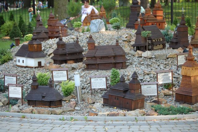 W związku z powyższym postanowiliśmy się ewakuować do m. Myczkowce. W tamtejszym Caritasie posiliśmy się smacznymi lodami i obejrzeliśmy bardzo ciekawą plenerową ekspozycję modeli drewnianych cerkwi i kościołów bieszczadzkich. Po raz kolejny (przy moim triumfie) zmieniliśmy "fahrplan" i udaliśmy się do Ustrzyk Dolnych. Bida w tych Ustrzykach była z miejscem na nocleg. Ostatecznie skorzystaliśmy z parkingu przy hotelu "Laworta" (taka nazwa).