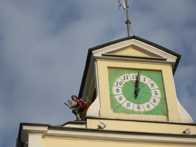 O godz.12.00 z wieży zegara wyskakuje Baba Jaga na miotle, maskotka Ziemi Świętokrzyskiej.