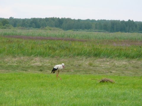 Normalnie tereny biebrzańskie zwiedza się z poziomu kajaka lub tratwy, ale postanowiliśmy zobaczyć te tereny z poziomu kampera. Biebrza plynie leniwie wśród łąk i nie wszyscy wiedzą, że jest to kraina różnego rodzaju ptactwa. Ściągają tu miłośnicy przyrody z całej Europy i namiętnie fotografują zyjące tu rzadkie gatunki ptaków. Naszymi sąsiadami na "polu namiotowym na końcu świata" byli Holendrzy, którzy z kamerami i aparatami fotograficznymi spędzali cale dnie w specjalnych tratwach, przystosowanych do podglądania ptactwa, żyjącego w tych okolicach. Ja ograniczyłem sie do sfotografowania najbardziej reprezentatywnego przedtawiciela tych terenów, czyli naszego poczciwego bociana.