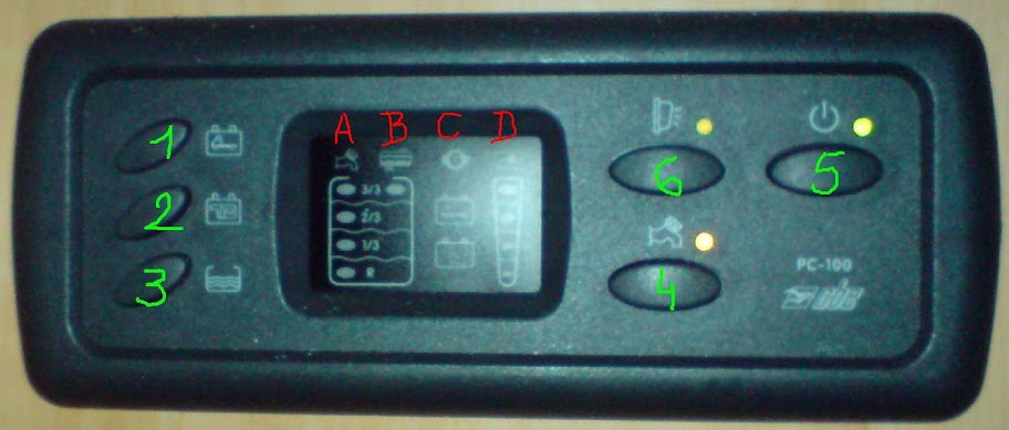 2: po nacisnieciu = pokazuje stan naladowania akumulatora pokladowego