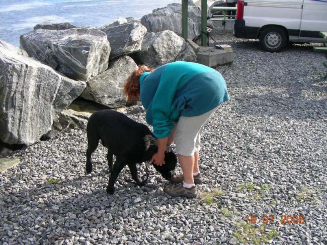 2006.07.19 252 Runde k.campingu (N).JPG kemping na wyspie Runde. Widać kawałek szweckiego kampera. Ten pies też szwedów. |
