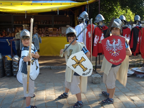 15 lipca 2010 - dzień 600-nej rocznicy Bitwy pod Grunwaldem. Wstaliśmy wcześnie (jak na wakacje), aby oporządzeni i wyszykowani, skoro tylko ranne straże opuszczą most zwodzony, stanąć do natarcia na zamek. Po śniadaniu, jeszcze przed otwarciem kas, ruszyliśmy na przedzamcze, a właściwie na otwarty dziedziniec Zamku Niskiego. Chłopcy musieli nabyć tam odpowiednie stroje i elementy uzbrojenia, aby wizyta w zamku i później na Polach Grunwaldzkich, nabrała niezbędnego realizmu. Nasi dzielni wojowie nie zrażali się takimi przyziemnymi szczegółami jak ceny, dlatego dzielni rodzice ze łzami w oczach i kurczowo zaciskając portfele, dostrzegając jednak bezcenną radość w oczach dzieci, stanęli na wysokości zadania i zasponsorowali zakupy.