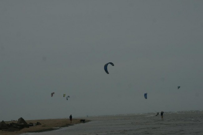 Noc upływa spokojnie przy wtórze huku wzburzonego bałtyku. Rano trochę się rozpogadza i idziemy na wycieczkę dookoła cypla.W oddali na horyzoncie widac latarnię morską i płynace do Rygi potężne kontenerowce. Przy brzegu z wiatrem walcza liczni KATESURFERZY, podrywani w góre przez porywy wiatru wykonują podniebne piruety..fascynujące !