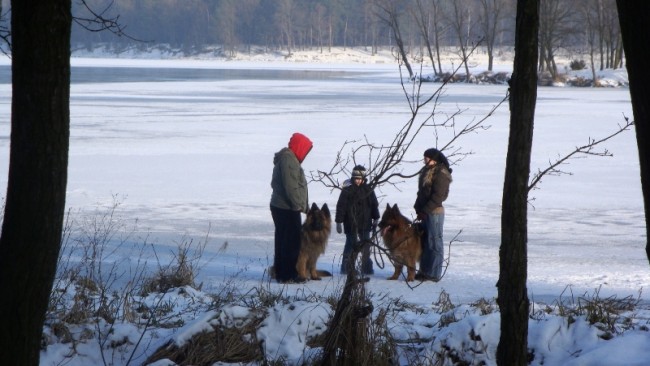 2011-01-29 so 007.JPG Psy i ich właścicielki hasały po lodzie, teraz odpoczywają (ale dalej na lodzie). Jest południowa część zalewu, ale schowana w lesie. |